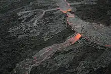 Pāhoehoe lava flow on Hawaii. The picture shows overflows of a main lava channel.