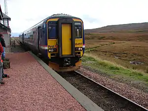 The accident occurred on the 18:20 passenger train from Glasgow Queen Street station to Oban which hit boulders on the line and derailed shortly before 21:00 BST (UTC+1).[2] The unit involved was Class 156 diesel multiple unit 156 499.[3] It was initially thought that two carriages had been left hanging over the 50-foot (15 m) embankment, although only one carriage was left in this position.[4] The leading bogie of the second carriage was also derailed.[5] There was a flash fire on the train, of insufficient duration to activate the on-board fire extinguishing system. Lubricating oil from a damaged engine crankcase had spilled on the sleepers, and ignited. The fire was quickly put out by the train conductor and a passenger with two hand fire extinguishers.[5]