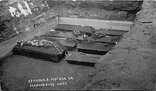 The burials were scheduled to take place on 5 April [O.S. 23 March] 1917, but prior to this news circulated that there would not be any funeral rites.[4] Relatives of the dead hurried to claim and bury them in other cemeteries with the traditional rites.[3] Ultimately only 184 victims were buried on the Field of Mars, comprising 86 soldiers, 9 sailors, 2 officers, 32 workers, 6 women, 23 people for whom social status could not be determined, and 26 unknown dead.[3][10] The city soviet declared 5 April a day off work, and many citizens turned out to accompany the funeral processions, which carried the dead from the hospitals and chapels across the city. The graves had been prepared by blasting trenches in the frozen ground, with the lowering of each coffin marked by a cannon shot from the Peter and Paul Fortress.[11] By one estimate some 800,000 people attended the funerals.[10] A competition for the design of the memorial was won by Lev Rudnev and the Monument to the Fighters of the Revolution was opened on 7 November 1919.[2][4] Epitaphs by Anatoly Lunacharsky, People's Commissar of Education, were inscribed around the memorial.[2][4][10]