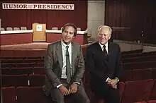 The library was the taping site of a PBS series on The Presidency and the Constitution that aired in 1987. In December 1988, it hosted a gathering of representatives from 44 nations for an All-Democracies Conference. Perhaps the most popular conference sponsored by the library and museum was Humor and the Presidency held at the museum September 17–19, 1986.[5] The conference featured presentations by politicians, well-known comedians, press secretaries, newspaper columnists, and political cartoonists to explore all sides of the topic. President Ford and Chevy Chase appeared on several morning news/talk shows generating wide interest in the event. The conference was taped for later broadcast on HBO.