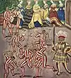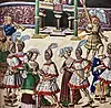 | 235 | ![]() | Tournament 59 Mummery | In this masquerade, the male dancers wear slashed doublets which dates the scene to around 1500 when that style was at the apex of fashion. The musicians play shawms, a form of woodwind instrument. | pp. 404-405 |