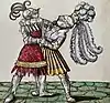 In each of the tournaments, the participants are shown engaging in a foot combat. A variety of weapons are used, including iron clubs (Eisenkolben), flails (Drischel), swords (Turnierschwert)[43] and daggers.[44] With one exception (folio 51), all the foot combat miniatures were painted by the same anonymous artist.[45]