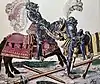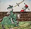 Over the next ten years planning sketches for the entire work were created[1] and Maximilian dictated a partially completed text of the story to his secretary.[7][8] According to the draft text,[9][10] the story is an account of a series of 64 tournaments in which Freydal – a young knight and Maximilian's literary alter ego – demonstrates his valour in combat in order to earn honour and fame[11] and to win the hand of a princess.[8] The theme of the story reflects Maximilian's own enthusiasm for jousting. Unusually for a powerful ruler, Maximilian was himself a regular participant in tournaments and continued to take part in jousts until at least 1511, when he was in his 50s.[12] His affinity for jousting contributed to his soubriquet the "last knight".[13]