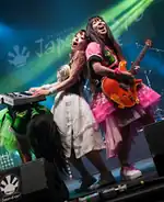 With lead vocalists Hana also drumming and Reona playing keyboards – stationary instruments – keeping them from interacting with the audience, in 2013, "performers" Mai (Mai Ichigo) and Arisa were recruited to fill the role. Mai initially joined alone, with Arisa following shortly after. They came to be known as the "Gacha Gacha Dancers",[2][3][19] with Mai also acting as choreographer.[14]