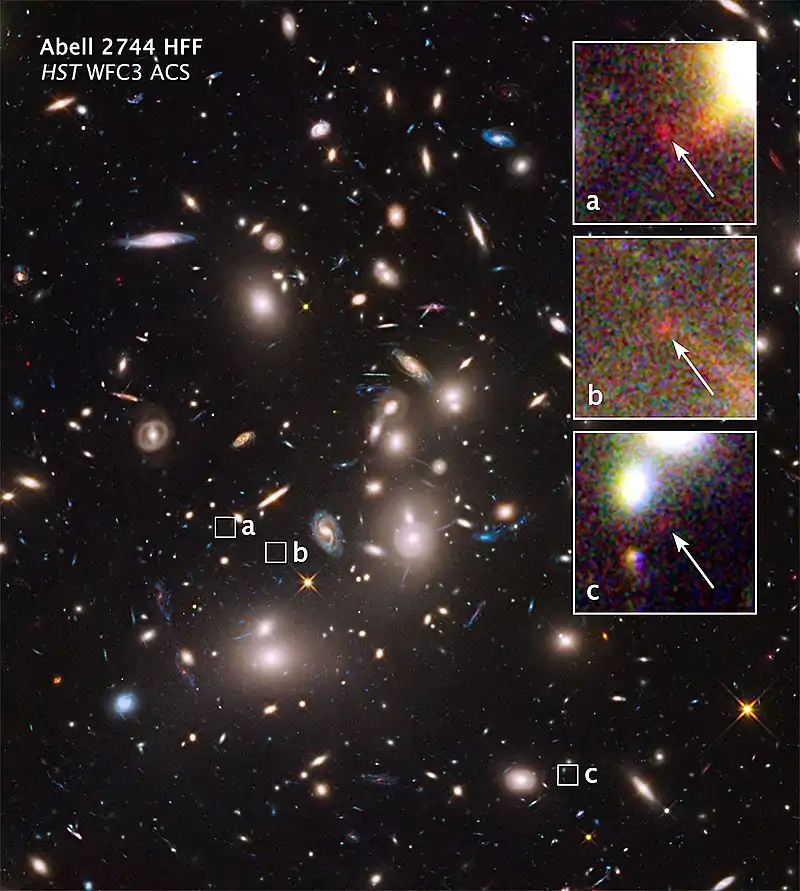 Abell 2744 galaxy cluster - extremely distant galaxies revealed by gravitational lensing (16 October 2014).[35][36]