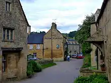 The village is unusual for its size in having a Post Office, a village hall, a children's nursery, a bakery, a village shop, and two public houses, the Farmer's Arms and the Hollow Bottom. Nearby are the excavated foundations of the original Anglo-Saxon church and a large kerbed round barrow shown as a tumulus on Ordnance Survey maps.[14] To a large extent, the village owes its preservation to the Guiting Manor Amenity Trust.