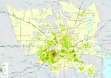 By 2005, 60% of Gulfton residents were not native born and represented citizenship from forty-two countries. Many residents were illegal immigrants.[6] More than 20% of the households did not own cars.[34] Starting in the mid-1980s, the Gulfton population experienced increases in female and children populations.[50] Peg Purser, an urban planner who directed a 1991 University of Houston Center for Public Policy study commissioned by the Houston Chronicle, identified that the Hispanic population growth in the Gulfton area was almost entirely from Central American countries. According to the study, between the 1980 and 1990 U.S. Censuses, Hispanic population density increased by 3,500 persons per square mile.[51] Between 1990 and 2000, the population of the area within the Gulfton Super Neighborhood increased by 13,347, from 33,022 residents to 46,369 residents or 40%.[3]