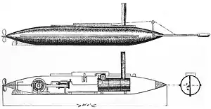Instead, a spar torpedo—a copper cylinder containing 135 pounds (61 kilograms) of black powder—was attached to a 22-foot (6.7 m)-long wooden spar, as seen in illustrations made at this time. Mounted on Hunley's bow, the spar was to be used when the submarine was 6 ft (1.8 m) or more below the surface. Previous spar torpedoes had been designed with a barbed point: the spar torpedo would be jammed in the target's side by ramming and then detonated by a mechanical trigger attached to the submarine by a line so that as she backed away from her target, the torpedo would set off. However, archaeologists working on Hunley discovered evidence, including a spool of copper wire and components of a battery, that it may have been electrically detonated. In the configuration used in the attack on Housatonic, it appears Hunley's torpedo had no barbs and was designed to explode on contact as it was pushed against an enemy vessel at close range.[13] After Horace Hunley's death, General Beauregard ordered that the submarine should no longer be used to attack underwater. An iron pipe was then attached to her bow, angled downwards so the explosive charge would be delivered sufficiently underwater to make it effective. This was the same method developed for the earlier "David" surface attack craft used successfully against the USS New Ironsides. The Confederate Veteran of 1902 printed a reminiscence authored by an engineer stationed at Battery Marshall who, with another engineer, made adjustments to the iron pipe mechanism before Hunley left on her last fatal mission on 17 February 1864. A drawing of the iron pipe spar, confirming her "David" type configuration, was published in early histories of submarine warfare.