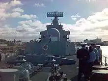 Bristol was refitted at A&P Tyne, Hebburn. The effects of the refit were said to "... extend the service life of HMS Bristol for 10 years". Work was intended to bring facilities on Bristol in line with health and safety standards.[7] The redundant masts containing the ship's Type 1022 and Type 992Q search radars were removed.[8] She departed from Portsmouth on 20 October 2010,[9] and arrived at Hebburn under tow on the morning of 3 November 2010. HMS Bristol left Hebburn in April 2011[10] to return to Portsmouth.