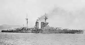 On 15 November 1918, representatives of the German Empire signed the terms of the armistice with the Allies on board the Queen Elizabeth. On 26 July 1924 she took part in the annual fleet review off Spithead and on 1 November 1924 was detached to the Mediterranean Fleet to replace the Iron Duke as flagship. She was then replaced as flagship by Warspite in May 1926 and decommissioned in Portsmouth for refit. After the refit, which lasted until December 1927, she was recommissioned as flagship of the Mediterranean Fleet on 2 January 1928 and visited Istanbul in October 1929. From November 1929 to May 1930 she underwent another overhaul at Portsmouth. In July of the same year, she was detached to Alexandria with Ramillies to support local troops during the uprising by the Waft Party.[21] From November 1932 to March 1933, the ship was overhauled in Portsmouth and took part in the fleet review off Spithead on 16 July 1935 during the 25th anniversary of George V's throne jubilee. She was also in Alexandria during the Abyssinia Crisis and took part in the fleet review marking the coronation of George VI off Spithead on 19 May 1937.[22] During the 1930s she participated in the non-intervention blockade during the Spanish Civil War.