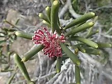 Hakea clavata, commonly known as coastal hakea[2] is a shrub that is endemic to an area along the south coast of Western Australia. It has thick leaves, pink and grey flowers and grows on rocky outcrops.