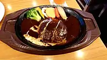 Hamburg (ハンバーグ, hanbāgu, Hamburg steak)[13] is a popular dish in Japan. It is made from ground meat with finely chopped onion, egg, and breadcrumbs flavored with various spices, and made into a flat, circular shape about 4 cm thick and 10 to 15 cm in diameter. Many restaurants specialize in various styles of hamburg steak.[14] Some variations include hanbāgu topped with cheese (チーズハンバーグ, or chīzuhanbāgu), hanbāgu with Japanese curry, and Italian hanbāgu (with tomato sauce rather than demi-glace).[15]
