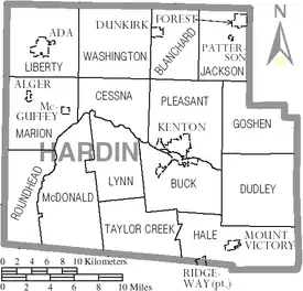 Hardin County is a county located in the west central portion of the U.S. state of Ohio. As of the 2020 census, the population was 30,696.[1] Its county seat and largest city is Kenton.[2] The county was created in 1820 and later organized in 1833.[3] It is named for John Hardin, an officer in the American Revolution.[4]