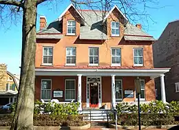 A small marketplace was created in 1802, but was rarely occupied. In 1809, Dr. William Darlington established the first foot pavement in town, although sidewalks would not become widespread until several years later.[7] The West Chester Academy, the antecedent to the modern West Chester University, was founded in 1813 and went on to educate many prominent Chester County citizens. Its first teachers were John Gemmil and Jonathan Gause.[8] A boarding school for girls was established sixteen years later.[9] In order to service the needs of local farmers, the Agricultural Society of Chester County was founded in 1820.[10] William Darlington established a natural history society in 1826.[11] In 1829, William Everhart began selling off some of his property at the southwest corner of the town, and several additional streets were opened. Around this time, ornamental shade trees were planted on streets to improve the scenery. By 1830, 1,244 people resided in the borough.[7]