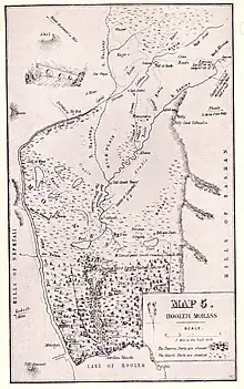 Ard el Huleh. The whole country of the marshes of the Huleh Lake, a swampy territory thickly overgrown with papyrus. It abounds in snipe, wild ducks, francolins and many other kinds of birds, and is consequently much resorted to by the hunter, but as carefully avoided by the inhabitants on account of the noxious fever.[12]