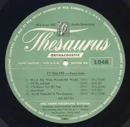 Cy Walter's piano version of "I'll Never Tire of You" was part of the now-defunct NBC Radio Network music. It was recorded on RCA Thesaurus transcription discs for the sole purpose of broadcasting on radio stations. These discs, which were advertised in magazines like Down Beat and others, provided material—from station-identification jingles and commercials to full-length programs—for use by local stations, which were affiliates of one of the radio networks. Efforts were made as early as 1936 to consolidate the RCA Victor transcription service with NBC's independent transcription service within the NBC radio network. NBC's Thesaurus catalog system and library of recordings was not completely merged with RCA's catalog until 1939 when the consolidation was completed in an effort to compete with rival transcription services which were available at the Mutual, Columbia and World Broadcasting Systems.