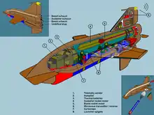 Known initially under the Rainbow Code name Blue Duck, the Ikara was a "rocket-thrown weapon" with similarities to the French Malafon. It differed from Malafon in that the torpedo was semi-recessed in the missile body rather than mounted in the nose. Ikara's range at 10 nautical miles (19 km) was double that of ASROC.[4] Ikara was generally considered a superior system to ASROC as it was accurately guided during flight to ensure optimal targeting. A submarine would be aware from sonar contacts that it was about to be attacked and could engage in evasive changes of course. In ASROC's flight time to maximum range of 55 seconds,[4] a submarine travelling at 25 knots (46 km/h) could move 700 metres (2,300 ft) from its position at launch, and a prediction would be made of the submarine's likely position at torpedo splashdown. But during the design of Ikara around 1960 the range of the acoustic seeker of the Mk.44 torpedo was limited to 457 metres (1,499 ft), and consequently its kill probability was low. The range of the acoustic seeker was later improved.[5]
