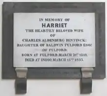 Charles Aldenburg Bentinck (1810-1891), brother, of Terrington St Clement in Norfolk, a Justice of the Peace for Devon. In 1849 he married firstly Harriet Fulford (1818-1853), 3rd daughter of Col. Baldwin Fulford (1775–1847),[33] of Great Fulford in the parish of Dunsford (6 miles north of Indio), an officer in the Inniskillen Dragoons and Lieutenant-Colonel of the Devon Militia. In 1850 he rebuilt Indio House, to the design of the Exeter architect David Mackintosh. The resultant house, which survives today, was described by Pevsner as "Austere Tudor relieved by romantic crenellated chimney-stacks".[34] Above the front door is a datestone inscribed "1850" with the initials "CAB", with the arms of Bentinck and the family's motto Craignez Honte ("fear disgrace"[35]).[36] He purchased the lordship of the manor of Bovey Tracey from William Courtenay, Earl of Devon.[5] His first wife died in 1853, aged 35, only 4 years after their marriage, and is commemorated by a mural monument in Bovey Tracey Church. He married secondly to Frances Williams (1816-1904), 2nd daughter of Martin Williams of Bryngwyn, Montgomeryshire, who erected a brass tablet in Bovey Tracey Church to her husband, and is herself similarly commemorated.