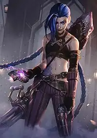 Illustrator Katie De Sousa posted conceptual artwork of the "gun-toting, braid-rocking criminal" that would ultimately become Jinx on a bulletin board for potential ideas at Riot Games.[1] De Sousa wanted to create a "completely insane female villain who is beyond any kind of reform or rehabilitation" for League of Legends.[2] De Sousa was also a fan of "Attack Damage Carry" (ADC), a term used to describe champions that deal high levels of continuous damage in matches. The character was given the codename "Psycho Arsenal" and remained on the board for months until August Browning, seeking to make a weapon-swapping ADC, decided to develop her with De Sousa, while her backstory was written by Graham McNeill.[3] They avoided giving her a "sexy persona" and instead depicted her as a pale and slender woman who wielded disproportionately oversized weapons to make her stand out from other female League champions.[1] The Joker, Gollum, and actress Helena Bonham Carter served as primary inspirations for Jinx's character.[2][4]