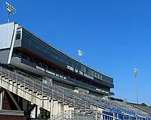 The press box and suites are located above the bleachers on the home side of Joe Aillet Stadium. Originally built in 1968 and expanded in 1988, the sky box was renovated and replaced in time for the 2017 season. The first floor of the facility includes multiple luxury suites for fans; and the second floor includes room for coaches, broadcast members, and gameday officials.[6] Additional signage was added onto the front, in time for the 2023 season, which highlighted the program's 3 national championships and 3 retired jersey numbers.