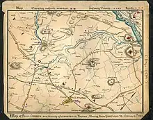 On the early morning of October 18, 1864, Captain Richard Montjoy led a contingent of at least 75 men from Company D of Mosby's command on a nocturnal raid into Falls Church.[10] The attack was initially successful, capturing several Union prisoners and a number of horses. However, the element of surprise was lost when members of the Home Guard blew a hunting horn as a warning to alert nearby Federal troops.[11]