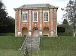 Left: Sculpted stone heraldic achievement c.1715–1730 above central arch keystone on the surviving Palladian library (right) at Stevenstone, built by John Rolle (1679–1730), showing on an escutcheon the arms of Rolle impaling Walter, the family of his wife Isabella Walter. Above is the crest of Rolle: A cubit arm erect vested or charged with a fess indented double cotised azure in the hand a flint-stone proper