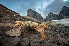 Johngarthia lagostoma is a species of terrestrial crab that lives on Ascension Island and three other islands in the South Atlantic. It grows to a carapace width of 110 mm (4.3 in) on Ascension Island, where it is the largest native land animal.[2] It exists in two distinct colour morphs, one yellow and one purple, with few intermediates. The yellow morph dominates on Ascension Island, while the purple morph is more frequent on Rocas Atoll. The species differs from other Johngarthia species by the form of the third maxilliped.