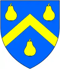 Arms of Calmady: Azure, a chevron between three pears or