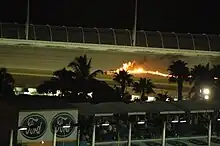 Montoya made his stock car racing debut in the Food World 250 (part of the ARCA Re/Max Series developmental championship) at Talladega Superspeedway as preparation for his first full-time NASCAR season,[87][94][97] starting second and finishing third.[88] Montoya entered the following Prairie Meadows 250 at Iowa Speedway, finishing 24th after starting third due to a collision with Steve Wallace.[98] He made his NASCAR debut in the Sam's Town 250 of the Busch Series at Memphis Motorsports Park, driving CGR's No. 42 Dodge, and competed in the final three 2006 Busch Series races.[99][100] Montoya had his best Busch Series start and finish of 2006 at Memphis, starting ninth and finishing eleventh.[100] He made his Nextel Cup Series debut in CGR's No. 30 Dodge at Homestead–Miami Speedway in the season-ending Ford 400 because Ganassi did not put him in Mears' No. 42 car to ensure his qualification.[101][102] Montoya started 29th at Homestead, but his car caught fire after Ryan Newman hit the back of his vehicle, sending him into the barrier.[86]