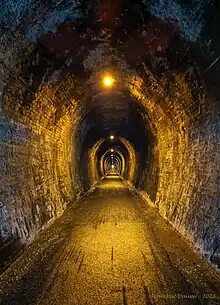 The East Coast Main Trunk Railway used to run through the gorge until it was bypassed by the Kaimai Deviation. The Karangahake Gorge section of the line, including a 1100-metre tunnel,[6] is now a combined walkway and cycleway, part of the Hauraki Rail Trail, and together with the natural sights of the gorge, makes it into a well-visited local tourist attraction.[7] The railhead at the Waikino end of the gorge still exists, preserved as part of the Goldfields Railway to Waihi.[8]