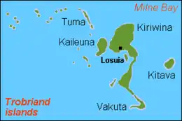 Kiriwina is the largest of the Trobriand Islands, with an area of 290.5 km².[1] It is part of the Milne Bay Province of Papua New Guinea. Most of the 12,000 people who live in the Trobriands live on Kiriwina. The Kilivila language, also known as Kiriwina, is spoken on the island. The main town is Losuia. The island falls under the administrative division of Kiriwina Rural LLG.