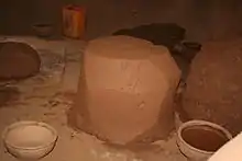 After a pot has been thrown it is left to dry to the leather-hard phase on the wheel. To prevent distortion in the drying process, throwers will often tie twine made from straw around the pot so it retains its circular shape. This is especially important to the stacking process.