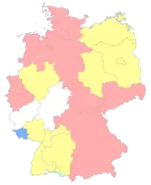 The Landesligas: Tier six (red) seven (yellow) and eight (blue) leagues. White denotes areas without Landesligas.