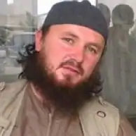 Arriving in Syria in late 2012, he joined the Syrian Civil War as a mujahid and became a leader of a unit of ethnic Albanian mujahideen, connected to the al-Nusra Front.[5] He returned to Kosovo in 2013, and was present at the 2013 Ramadan festival, as part of the Islamic Community of Kosova, in Kačanik, as evidenced by photographs.[6] He then returned to Syria the same year, becoming a mujahideen leader of the Islamic State of Iraq and the Levant (ISIL, or IS), directly reporting to IS caliph Abu al-Baghdadi, leading a platoon of ethnic Albanian fighters.[6] Muhaxheri was a link between the IS and ethnic Albanians in Albania, Kosovo, and Macedonia.[8] Some 500 ethnic Albanians from the Western Balkans fight for the IS, out of whom 232 are from Kosovo (May 2015).[8] Muhaxheri was described as an "intelligent and an experienced military strategist".[8]