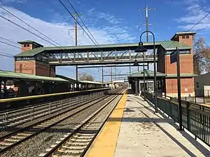 The station underwent a $37.3 million reconstruction project which includes fully accessible high-level platforms, a pedestrian overpass, and parking improvements.[8][9][10] The new platforms and overpass and a new parking lot opened on October 15, 2018; the old underpass and north parking lots were closed for the remaining construction period.[11] The station's reconstruction was completed and rededicated in October 2019.[10]