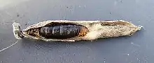 Pupal case cut open to reveal the pupa and extra silk lining.