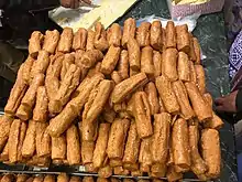 India | A South Indian snack of savory crunchy twists made from rice and urad dal flour.[2] Murukku means twisted in the Tamil language.[3] The town of Manapparai in Tamil Nadu is particularly known for its murukku.[4] Murukku is made in many varieties as a traditional treat for festivals such as Diwali and Krishna Janmashtami.[5] Murukku are often served on special occasions within Iyer (Tamil Brahmin) families.[6] |