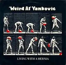 "Living with a Hernia" is a spoof of "Living in America" by Dan Hartman and Charlie Midnight (which was also the theme to the 1985 film Rocky IV). As the title suggests, it is about hernias.[1][2] When it came time to pick a song to parody as the lead single for Polka Party! Scotti Brothers Records "had some very strong ideas" and wished to have Yankovic parody a musician who was signed on the same label. After "Living in America" became a hit, the record label insisted that Yankovic parody the song, to which Yankovic obliged.[3] In order to accurately write the song, Yankovic researched the various types of hernias.[2] On August 4, 1986, Yankovic began recording parodies for Polka Party!, starting with "Living With a Hernia".[4]