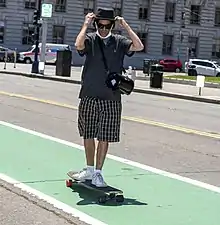 The ‘helmet culture’ is more prevalent in longboarding than in conventional skateboarding.[8] Most riders wear protective equipment in all disciplines, and nearly all professionals wear a helmet and gloves. Longboard protective equipment is similar to standard skateboard equipment, with the exception of slide gloves. Most longboarders wear slide gloves and helmets,[9] as these are considered the bare minimum for protection. Additional protection includes leathers, wrist guards, knee pads, elbow pads and sometimes spine protectors and padded shorts. Many professional longboarding teams and riders are required to wear and advocate all aspects of protection. In the sliding and downhill disciplines, riders wear "slide gloves" which are specialized gloves made out of strong materials such as leather and synthetic fabrics, and have large discs called "pucks" attached to the palms. These are attached to protect the hands as the rider uses them to pivot during slides along the ground. The pucks are usually made of synthetic polymers: delrin, UHMW, or corian.