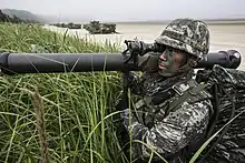 Adopted in 1959 in Army service, the M67 was used in the Vietnam War together with the much larger 106 mm M40.[3] The M67 proved an effective weapon, though it was primarily used against personnel in combat, and saw little or no use against armor and even against fortifications.[4] While troops praised its effectiveness, the M67 came under heavy criticism due to the weapon's weight and length as well as its backblast, which often precluded its use in offensive operations.[4] Because of these disadvantages, the Marine Corps units continued to use the old M20 Super Bazooka in preference to the M67.[5] It was largely replaced in Army service by the M47 Dragon anti-tank missile system starting in 1975.[4] The M67 was also issued to anti-armour platoons of 1 ATF (Australian/New Zealand Task Force) during the Vietnam war, being used near the perimeter of the defense bases due to its weight.[6] The M67 was issued in lieu of the standard issue Carl Gustav for these armies. This may have been to simplify logistics, or it may be that ammunition for the Carl Gustav could not be sourced due to Swedish opposition to the war in Vietnam.