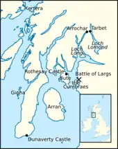 While Lennox was being plundered,[54] Hákon and his main force, stationed between the Cumbraes and the Scottish mainland,[55] were occupied with the events surrounding the Battle of Largs, between 30 September and 3 October.[56] Although claimed by later Scottish chroniclers as a great victory, in reality the so-called battle was nothing more than "a series of disorderly skirmishes", with relatively few casualties that achieved little for either side.[56] Following the encounter, Hákon led his fleet northward up through the Hebrides. At Mull, he parted with his Norse-Gaelic lords: Dubhghall was rewarded with Eóghan's former island-domain; Murchad was given Arran, and a certain Ruaidrí was given Bute.[57][note 7] The Norwegian fleet left the Hebrides and reached Orkney by the end of October, where an ill Hákon died in mid December.[61] Despite the saga's claim that Hákon had been triumphant,[62] in reality the campaign was a failure. Alexander's kingdom had successfully defended itself from Norwegian might, and many of Hákon's Norse-Gaelic supporters had been reluctant to support his cause.[61]