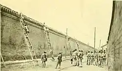 The attack began the next day, with royalists troops entrenched on the wall of the Temple of Heaven.[22] Shortly after the fighting began, negotiations resumed, resulting in the royalists giving up their positions. General Zhang, dismayed, fled to the legations quarter.[22] Once General Zhang had fled, the royalist troops called for a ceasefire, which was immediately granted.[22]