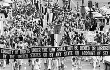 The amendment proposed equal rights for women, and was first introduced to Congress in 1923, finally gaining Congressional approval in 1972.[5] Once Congress had approved the amendment, ratification by the states was requested and the typical 7-year time limit for ratification by two-thirds of the states was set in motion.[6] The march was held to convince legislators that the period allowed for ratification should be extended beyond the deadline, which would occur on 29 March 1979.[7] Protesters were successful in getting the House to approve an extension to 1982 in August, 1978 and the Senate to grant approval of the same time frame by a vote of 60 to 36 in October 1978. It was the first time that a proposed amendment to the Constitution had ever had its ratification period extended.[8][9] Since 1982, extension of the ratification has been reintroduced in every legislative session.[10]