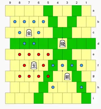 The rook (4d) moves along a rank (two directions) or cants (four directions) to any green-colored cell in the diagram.[lower-alpha 1] The king (7f) moves one step in any direction (red-colored dots). The gold general (7c) moves one step like a rook in any direction, or one step diagonally forward (blue dots). The silver general (3g) moves one step diagonally in any direction, or one step forward on a cant (blue dots).