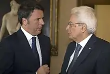 Renzi's victory was welcomed by Prime Minister Letta,[70][71] who had been the vice-secretary of the party under Bersani's leadership.[72] Throughout January and February 2014, there were multiple reports of persistent leadership tensions between Renzi and Prime Minister Letta.[73][74][75] Many said that Renzi was pressuring Letta to resign in his favour, arguing that he should be given the right to become Prime Minister, as he was the PD's leader.[76][77] On 12 February, Letta acknowledged these rumours for the first time, publicly demanded that Renzi make his position clear.[78] Renzi subsequently called a meeting of the PD leadership for the following evening.[79] Just before the meeting took place, Renzi publicly called on Letta to resign and allow him to form a new government.[80] Letta initially resisted the demand;[81][82] following a vote in favour of Renzi's proposal during the meeting, which Letta did not attend,[83] he announced that he would tender his resignation as Prime Minister on 14 February.[84]