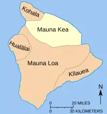 Clickable imagemap of Hawaiʻi island showing the location of Mauna Kea, making up 22.8 percent of the island's surface area[4]