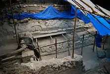 Warfare was prevalent in the Maya world. Military campaigns were launched for a variety of reasons, including the control of trade routes and tribute, raids to take captives, scaling up to the complete destruction of an enemy state. Little is known about Maya military organization, logistics, or training. Warfare is depicted in Maya art from the Classic period, and wars and victories are mentioned in hieroglyphic inscriptions.[139] Unfortunately, the inscriptions do not provide information upon the causes of war, or the form it took.[140] In the 8th–9th centuries, intensive warfare resulted in the collapse of the kingdoms of the Petexbatún region of western Petén.[140] The rapid abandonment of Aguateca by its inhabitants has provided a rare opportunity to examine the remains of Maya weaponry in situ.[141] Aguateca was stormed by unknown enemies around 810 AD, who overcame its formidable defences and burned the royal palace. The elite inhabitants of the city either fled or were captured, and never returned to collect their abandoned property. The inhabitants of the periphery abandoned the site soon after. This is an example of intensive warfare carried out by an enemy in order to eliminate a Maya state, rather than subjugate it. Research at Aguateca indicated that Classic period warriors were primarily members of the elite.[142]