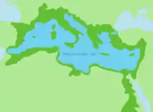The Romans called it Mare Magnum ("Great Sea") or Mare Internum ("Internal Sea") and, starting with the Roman Empire, Mare Nostrum ("Our Sea"). The term Mare Mediterrāneum appears later: Solinus apparently used this in the 3rd century, but the earliest extant witness to it is in the 6th century, in Isidore of Seville.[5][6] It means 'in the middle of land, inland' in Latin, a compound of medius ("middle"), terra ("land, earth"), and -āneus ("having the nature of").