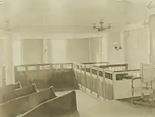 The colonial meeting house in America was typically the first public building built as new villages sprang up. A meeting-house had a dual purpose as a place of worship and for public discourse, but sometimes only for "...the service of God."[6] As the towns grew and the separation of church and state in the United States matured, the buildings that were used as the seat of local government were called town-houses[7] or town-halls.[8]