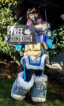 On October 6, 2019, Blizzard suspended professional Hearthstone player Chung "Blitzchung" Ng Wai for making statements in support of the ongoing protests in Hong Kong during a Grandmasters livestream interview, with Blizzard asserting that Blitzchung had violated rules related to their behavior and respecting Blizzard's image. Blizzard's actions were criticized globally, and as part of the reactions, Hong Kong protesters and others began to illustrate Mei as a supporter of the protests as a show of solidarity against Blizzard's decision.[43] A hashtag "#Meisupportshongkong" trended on social media websites such as Reddit and Twitter, while protesters appeared outside of BlizzCon in 2019, giving out shirts showcasing Mei holding the Hong Kong flag.[31][44] Fan artists on said social media also contributed, drawing depictions of the character in opposition of the Chinese government and its policies in part to portray the character as a "pro-democracy" icon but also an attempt by some to goad China into banning Overwatch.[45]